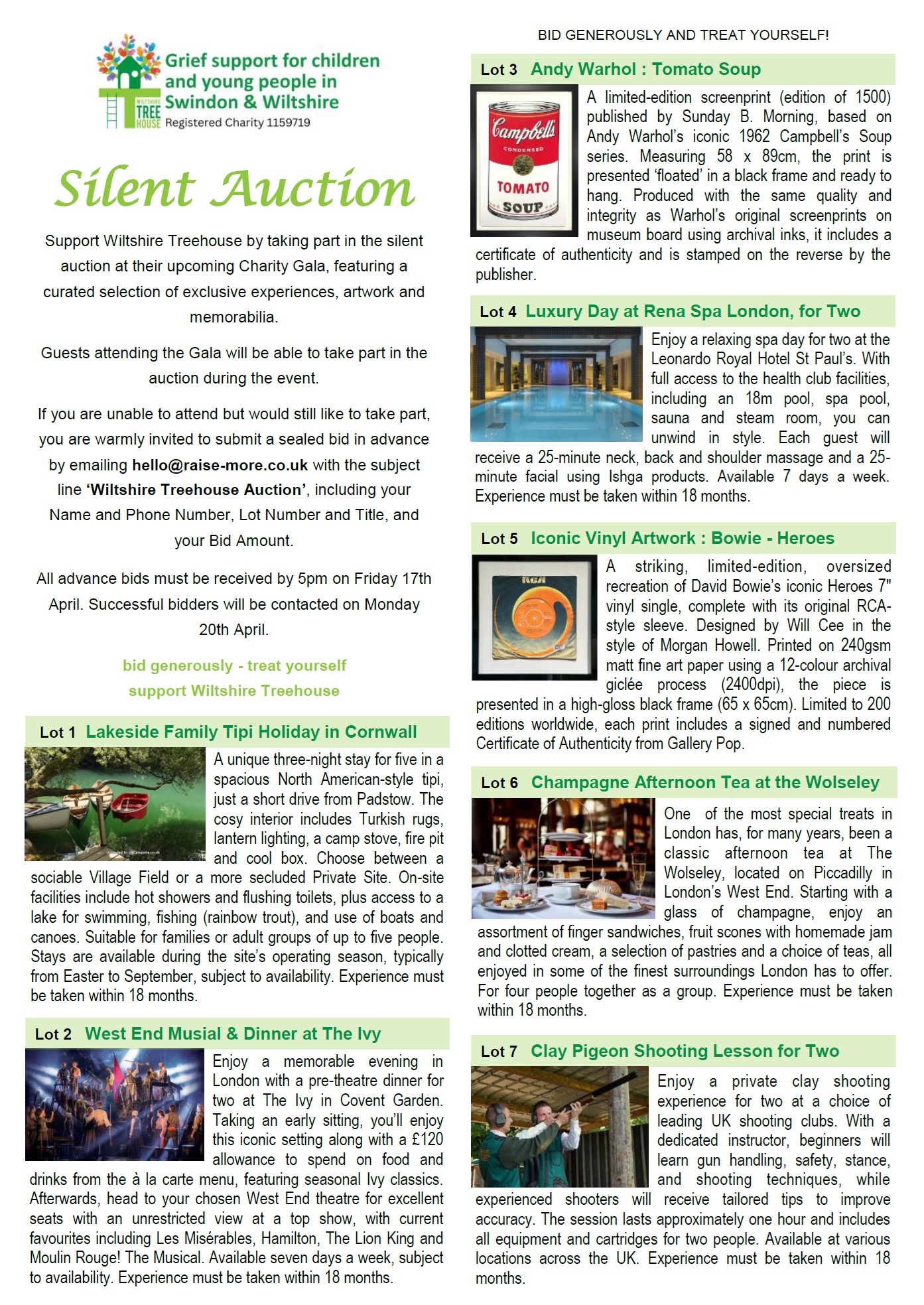 If you are unable to attend on the night but would still like to take part, you are warmly invited to submit a sealed bid in advance by emailing hello@raise-more.co.uk with the subject line ‘Wiltshire Treehouse Auction’, including your Name and Phone Number, Lot Number and Title, and your Bid Amount.